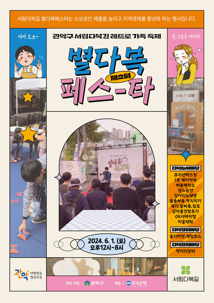 [시민일보 = 여영준 기자] 관악구(구청장 박준희)가 오는 6월1일 주민과 상인이 함께 즐길 수 있는 제2회 ‘서림다복길 별다복페스타’를 개최한다.