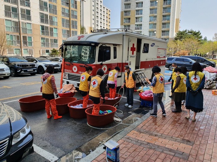 경기 양주시 양주2동 적십자봉사회가 지난 19일 소외된 이웃을 위해 봄맞이 이불세탁 봉사활동을 전개했다. 이날 대한적십자사 의정부봉사관의 이동 세탁 차량을 지원받아 이불 40여채를 수거하고 세탁해 배달했다. 사진은 이날 봉사에 참여한 회원들이 이불빨래를 하고 있는 모습. (사진제공=양주시청)