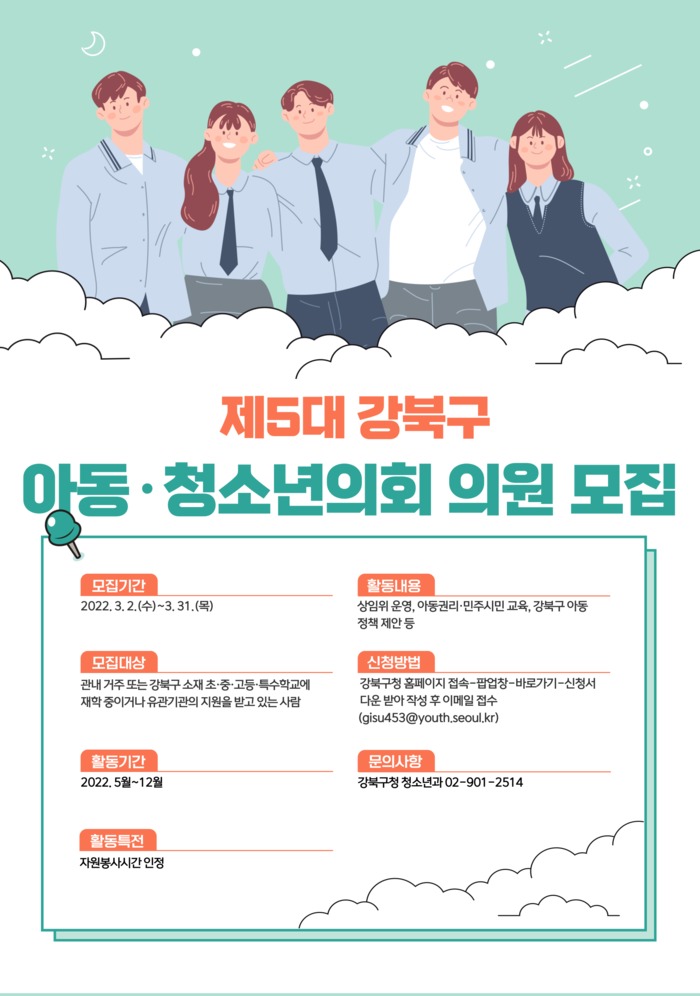 [시민일보 = 박준우 기자] 서울 강북구(구청장 박겸수)는 오는 3월2~31일 제5대 강북구 아동·청소년 의회 의원 60명을 모집한다.