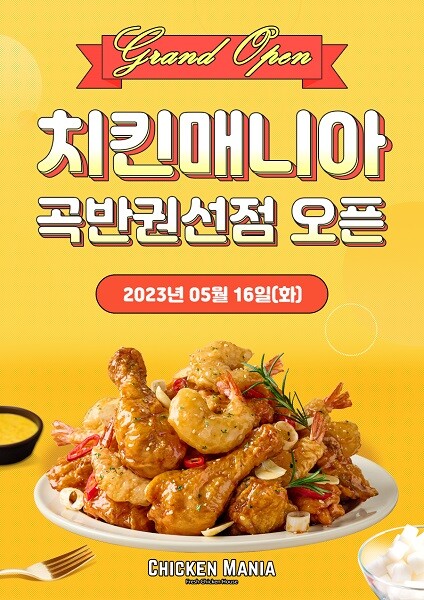 한편, 이번에 오픈한 치킨매니아 곡반권선점은 권선구 동수원로에 위치해 있으며 권선, 곡선, 망포, 세류, 매탄동 일부가 배달구역이다.