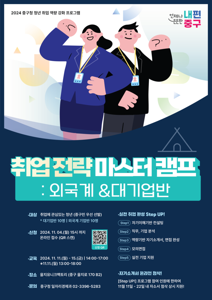 마스터캠프 참여를 원하는 청년 구직자는 11월 4일까지 QR스캔을 통해 온라인으로 접수하면 되고, 중구민을 우선 선발한다.