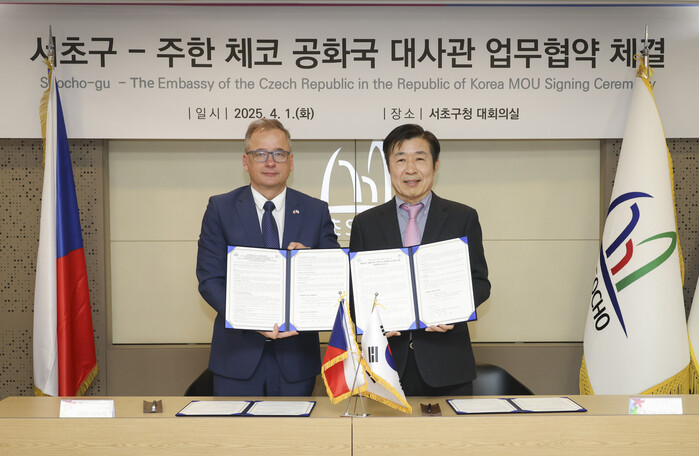 [시민일보 = 박소진 기자] 서초구(구청장 전성수)가 지난 1일 구청 5층 대회의실에서 주한 체코 공화국 대사관과 ‘바츨라프 하벨 벤치 조성 및 우호협력 증진을 위한 업무협약(MOU)’을 체결했다고 밝혔다.