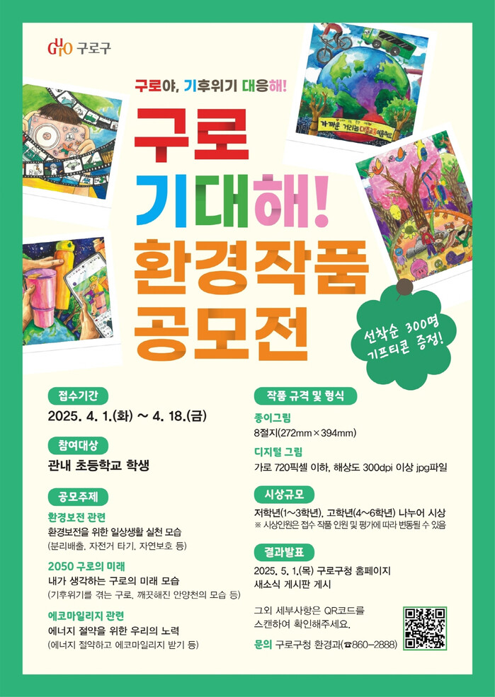 이번 공모전 ‘구로기대해!(구로야, 기후위기 대응해!)’는 미래세대 꿈나무들에게 녹색생활 실천문화를 확산하고 환경보전 의식을 높이고자 마련됐다.
