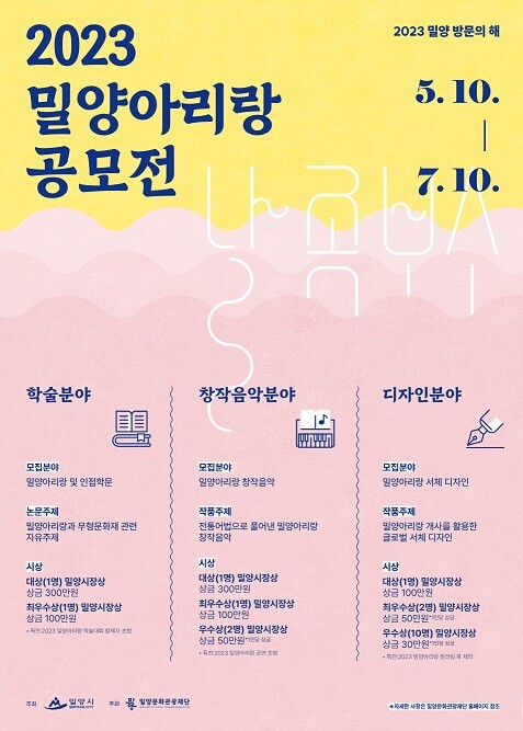 다양한 우수 콘텐츠 확보로 밀양아리랑 활성화에 목표를 둔 이번 공모전은 학술·창작음악·디자인(가사) 등 모두 3개 분야에 ‘밀양아리랑’에 관심 있는 사람이라면 누구나 참가할 수 있다.