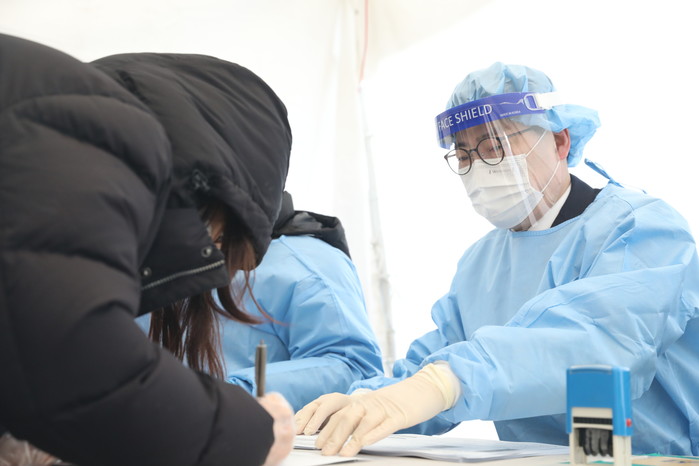 이정훈 강동구청장이 새해를 맞아 암사역사공원 임시선별검사소와 강동구 보건소 상황실을 방문해 현장에 투입된 의료진·자원봉사자 등을 만나 격려했다. 사진은 지난 1일 이 구청장(오른쪽)이 암사동 임시선별검사소로 검사를 받으러 온 주민들에게 문진표 작성에 대해 안내하고 있는 모습. (사진제공=강동구청)