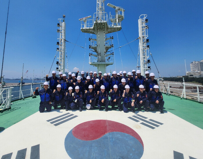 | 특별 승선 실습을 수료한 교육생들이 기념촬영을 하고 있다. [사진=해기교육원] |