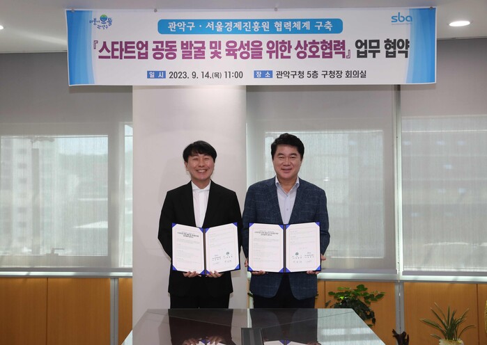 | ▲ 올해 서울경제진흥원(SBA)과 협약을 체결한 박준희 관악구청장.(사진=관악구청 제공) |