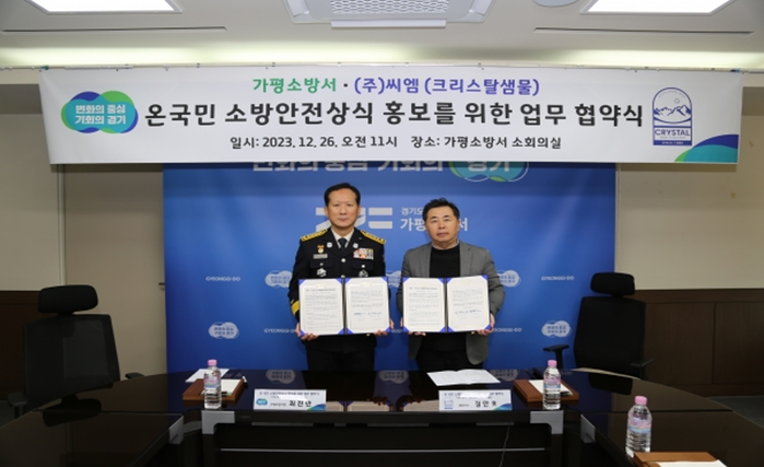 또한 가평소방서와의 협약을 통해 소방 인력의 안전을 돕고, 재난 발생 시 신속한 대응을 위한 준비를 지원함으로써 지역 사회의 안전을 지키고 있다. 지난 12월 26일, 크리스탈샘물과 가평 소방서 주요 관계자 7명이 참석한 가운데 소방 안전 상식 대국민 홍보를 위한 업무 협약을 체결했다. 최근 잇따른 화재로 인명·재산 피해가 증가함에 따라 누구나 쉽게 소방 안전 상식을 접할 수 있는 기회를 위해 추진됐다. 가평소방서와 (주)크리스탈샘물은 협업을 통해 화재·응급처치 등 소방안전상식을 효과적으로 홍보하여 화재로 인한 각종 피해를 예방하고, 기업은 사회공헌활동 참여로 기업의 지역 상생 경영과 긍정적인 이미지 구축에 기여할 전망이다.