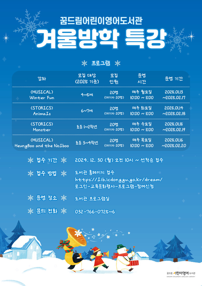 [인천=문찬식 기자] 인천 동구 꿈드림어린이영어도서관은 겨울방학을 맞아 지역내 유아 및 초등학생의 영어 학습과 독서 능력 향상을 위한 겨울방학 특강을 운영한다고 7일 밝혔다.