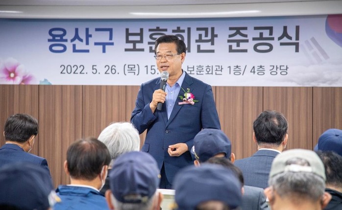 서울 용산구는 최근 보훈회관(보광로60길 14-9) 준공식을 개최했다. 보훈회관은 지하 1층~지상 4층에 연면적 1068㎡ 규모로 편의시설, 공용 공간, 9개 보훈단체 사무실 등을 갖추고 있다. 사진은 준공식에서 성장현 구청장이 축사를 하고 있는 모습. (사진제공=용산구청)