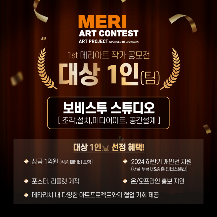 올해 진행했던 메리아트 공모전에는 총 508명의 작가가 참여하였다. 508명의 지원자 중 27명이 1차 심사에 통과하여 2차전을 겨루었다. 이후 최종적으로 심사위원들의 심층 면접을 진행하여 대상자를 선정하였다. 심사위원에는 서울대학교 미술대학 교수로 알려진 심상용 교수를 포함하여 이재용 작가, 홍경한 미술평론가, 오정은 미술비평가 등이 참여하였다. 1등 상을 받은 보비스투스튜디오에게는 상금 1억 원이 주어졌고, 올해 하반기에 강촌 인터스텔라 리조트와 서울의 두남재갤러리에서 개인전도 펼칠 수 있다.