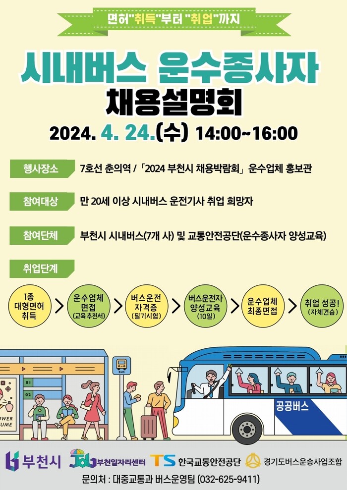 [부천=문찬식 기자] 경기 부천시가 오는 24일 춘의역에서 열리는 ‘2024 부천 채용박람회’에서 ‘시내버스 운수종사자 채용설명회’를 개최한다.