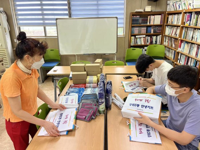 | ▲ 우리동네돌봄단과 청소년 자원봉사자들이 무더위 극복 안녕키트를 포장하고 있다. (사진제공=성북구청) |