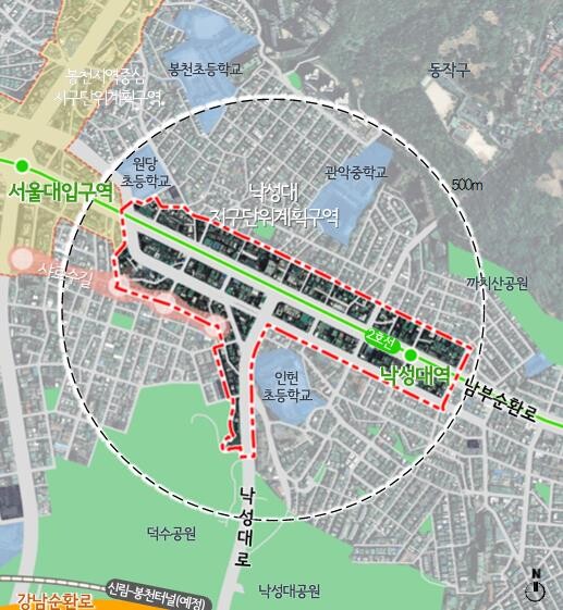 | ▲ 낙성대 지구단위계획 위치도 및 건축물 용도 완화 결정도 (사진=관악구청 제공) |