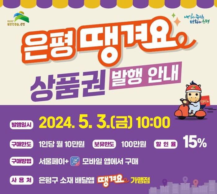 [시민일보 = 이대우 기자] 은평구(구청장 김미경)가 지역내 소상공인의 높은 배달중개수수료 부담을 완화하고 소비자에게는 할인된 금액으로 공공배달앱을 이용할 수 있도록 오는 5월3일 ‘은평땡겨요상품권’ 15% 할인 판매를 시작한다고 밝혔다.