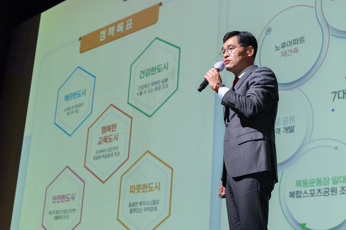 | ▲ 올해 1월 신년인사회에서 예산 규모를 설명 중인 이기재 구청장. (사진=양천구청 제공) |