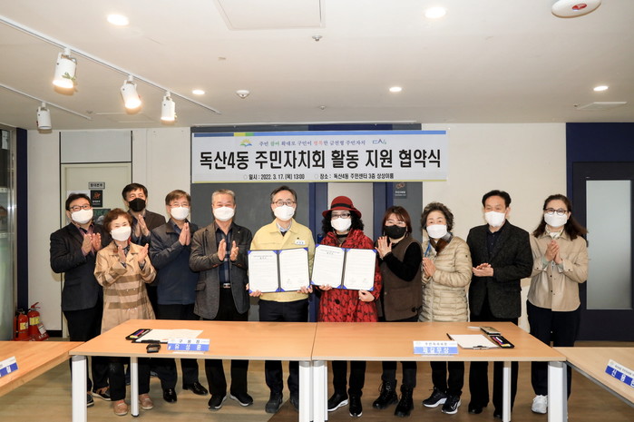 서울 금천구는 오는 31일까지 전동 주민자치회와 ‘금천형 주민자치회 활동 지원 협약식’을 개최한다. 사진은 최근 독산4동 주민자치회 활동지원 협약식에서 유성훈 구청장(가운데)이 관계자들과 기념촬영을 하는 모습. (사진제공=금천구청)