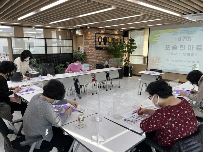 강남사회서비스지원센터가 개소하면서 원데이클래스로 시작된 ‘마음힐링 프로그램’은 현재까지 코로나19 방역수칙을 준수하며 꾸준히 진행되고 있다. 올해부터 포슬린아트, 캘리그라피 등 정기 강좌와 비누공예, 마크라메 등 특별강좌가 3개월 단위 학기제로 진행된다. 센터 내 모든 마음힐링 프로그램은 강남구 내에서 활동 중인 사회서비스 종사자라면 누구나 무료로 참여할 수 있다.