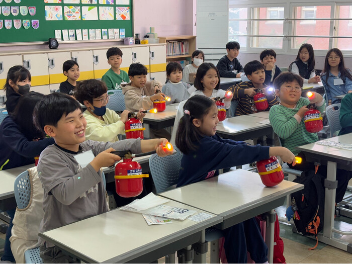| ▲ 지역내 초등학생들이 소화기 사용법 교육을 듣고 있다. (사진=성동구청 제공) |