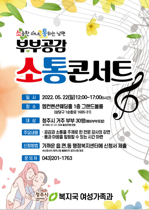 청주시는 오는 5월 22일(일) 낮 12시, 청주 엠컨벤션웨딩홀에서 부부공감 소통콘서트를 개최한다.