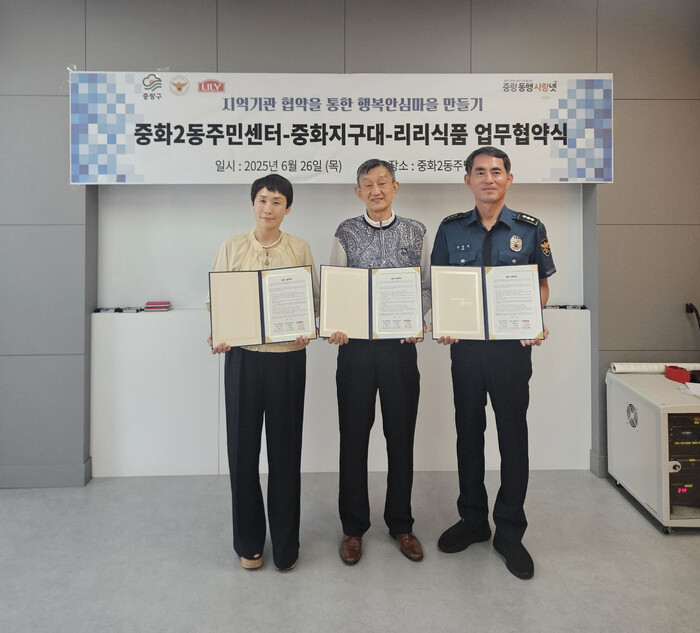[시민일보 = 여영준 기자] 중랑구(구청장 류경기) 중화2동주민센터가 지난 6월26일, 중화지구대(지구대장 임장빈), 리리식품(대표 백주현)과 함께 ‘행복안심마을 만들기’ 업무협약(MOU)을 체결하고, 민·관 협력을 통한 복지와 치안이 결합된 안전망 구축에 본격 나섰다.