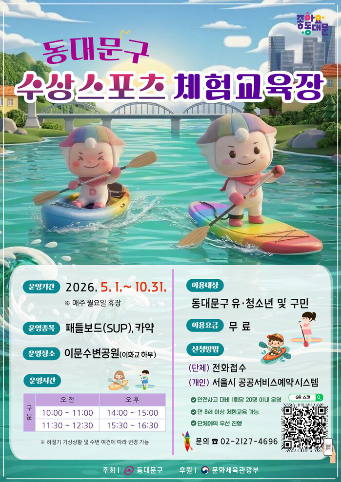 [시민일보 = 이대우 기자] 동대문구(구청장 이필형)가 오는 5월1일부터 ‘중랑천 수상스포츠 체험교육장’을 개장한다.