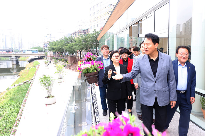 | ▲ 오세훈 서울시장(오른쪽 두 번쨰)과 이순희 구청장(왼쪽 두 번째)이 ‘우이천 수변활력거점 개장식’에서 관계자들과 현장을 둘러보고 있다. (사진=연합뉴스 제공) |