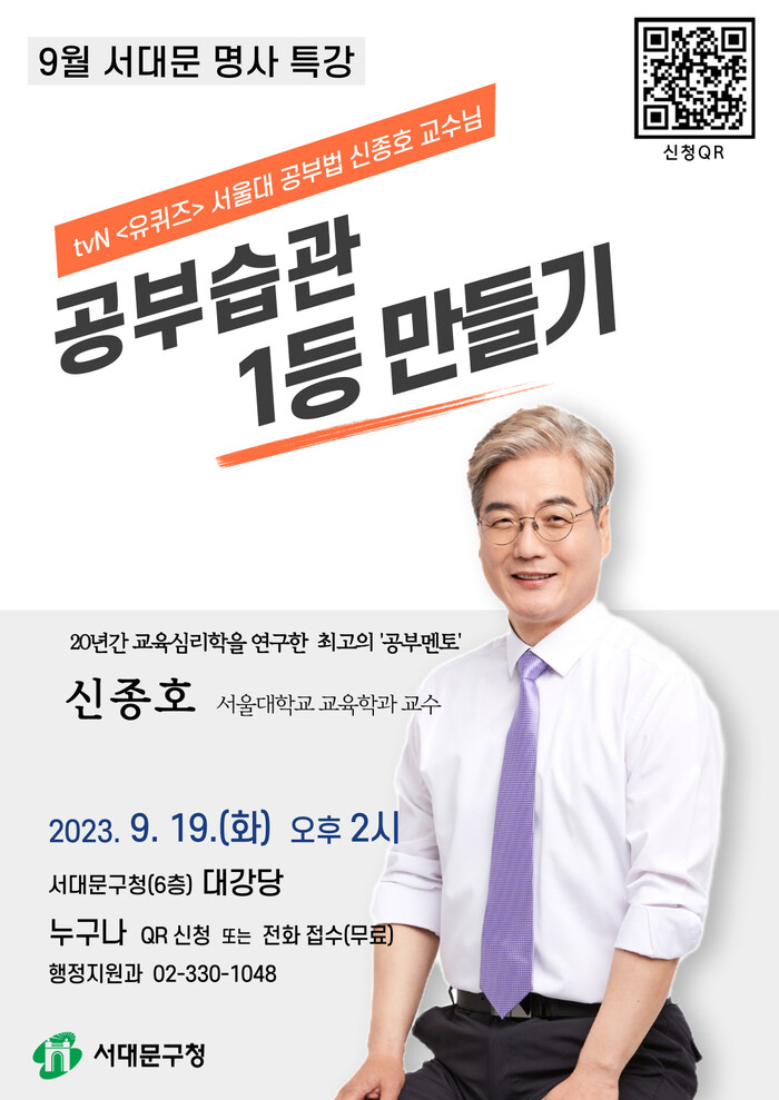 | ▲ 신종호 교수의 9월 서대문 명사 특강 ‘공부습관 1등 만들기’ 포스터. (사진=서대문구청 제공) |