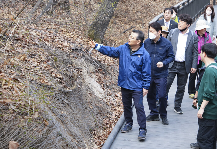 | ▲ 봉화산 동행길을 점검 중인 류경기 중랑구청장의 모습. (사진=중랑구청 제공) |