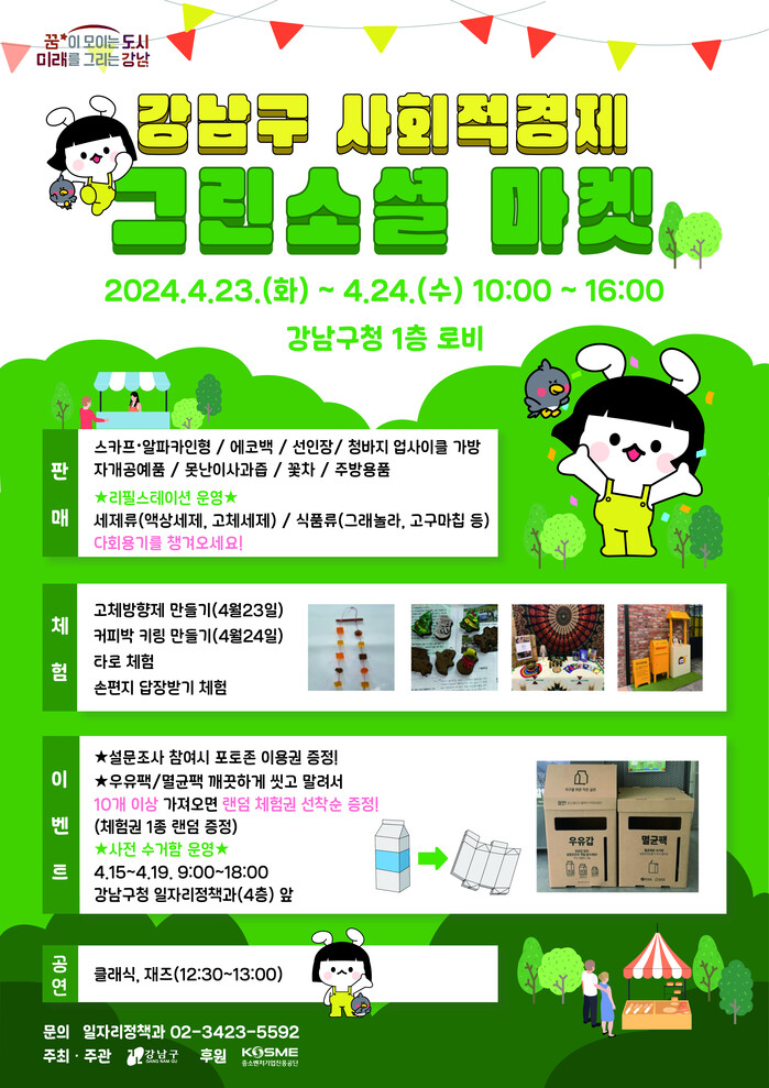 [시민일보 = 이대우 기자] 강남구(구청장 조성명)가 23~24일 오전 10시~오후 4시 구청 1층 로비에서 ‘사회적경제 그린소셜 마켓’을 개최한다.