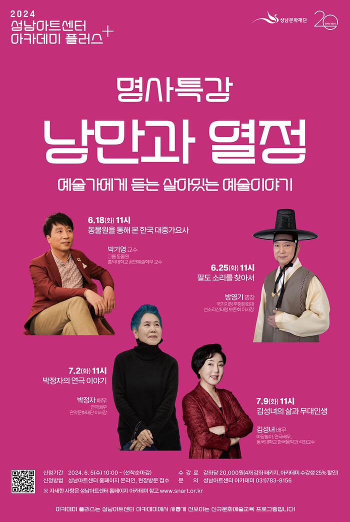 이번 ‘명사특강 낭만과 열정’은 대중음악부터 전통예술, 연극, 마당놀이까지 장르별 문화예술 명사 4명이 오는 6월 18일(화)부터 매주 화요일, 다양한 예술의 이야기를 릴레이로 소개하는 특별한 시간이다.