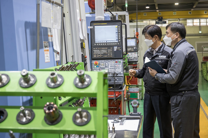 | ▲ 경기 안산시에 위치한 금형생산기업 건우정공에서 박순황 회장(왼쪽)과 삼성전자 스마트공장지원센터 임선우 프로(오른쪽)가 CNC 가공설비를 살펴보고 있다 (사진제공=삼성전자) |