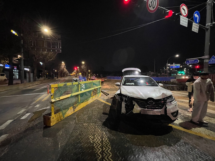| ▲ 암사동 선사유적지 인근 도로에서 승용차가 지하철 공사 현장 가드레일을 들이받는 사고가 발생했다. (사진제공=강동구의회) |