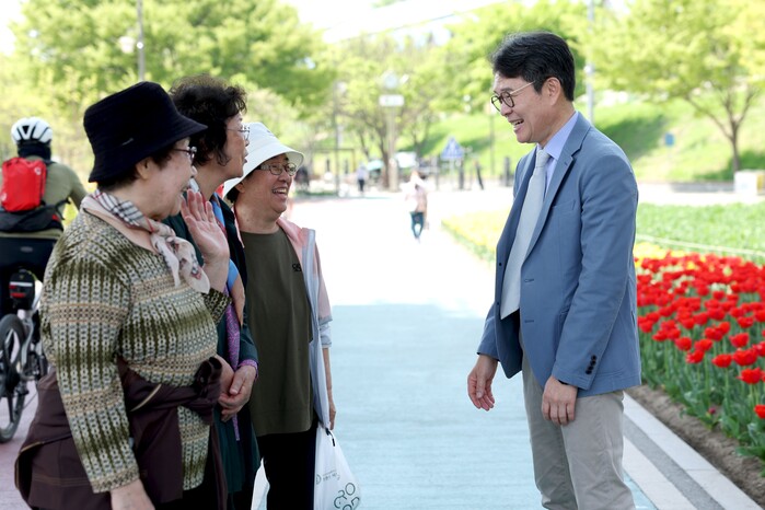 | ▲ ▲ 중랑천 튤립꽃길에서 정원오 성동구청장(사진 오른쪽)이 주민들과 인사를 나누고 있다. (사진=성동구청 제공) |