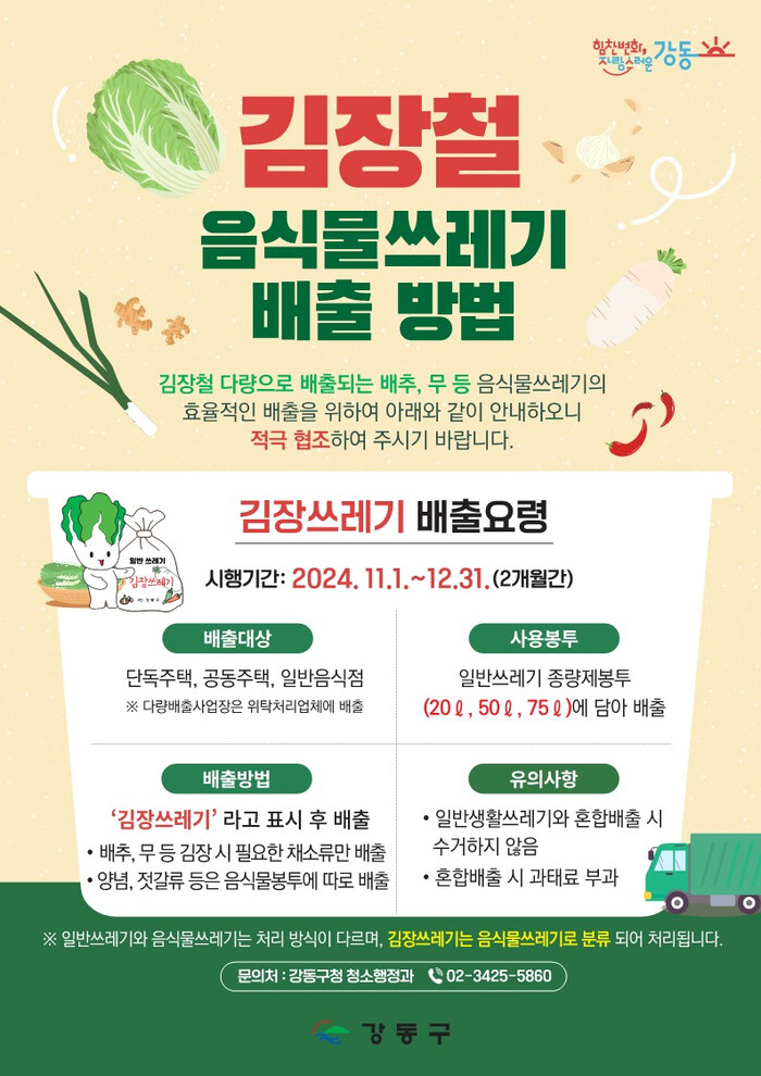 김장철 음식물쓰레기 배출 방법에 관한 자세한 사항은 강동구청 누리집을 참고하거나 청소행정과로 문의하면 된다.