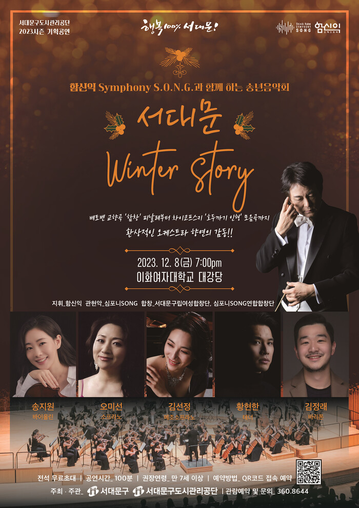 [시민일보 = 홍덕표 기자] 서대문구(구청장 이성헌)가 연말을 맞아 오는 12월8일 이화여자대학교 대강당에서 2023 송년음악회 '서대문 윈터 스토리(WINTER STORY)'를 개최한다.
