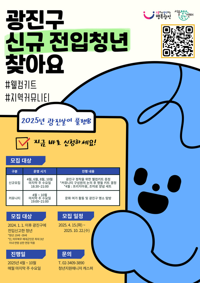 [시민일보 = 여영준 기자] 광진구(구청장 김경호)는 지역내 전입 청년들이 지역 사회에 안정적으로 정착할 수 있도록 돕는 ‘광진살이 플랜B’를 운영하고 있다고 밝혔다.