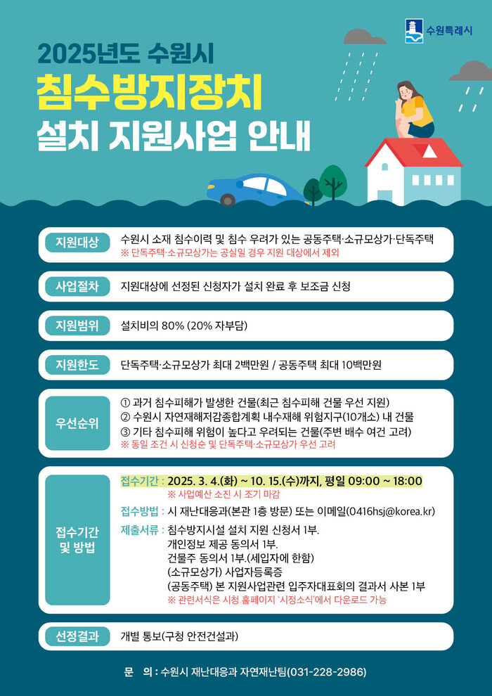 [수원=임종인 기자] 경기 수원시가 풍수해로 인한 건축물 침수 피해를 예방하기 위해 ‘2025년도 침수방지장치 설치 지원사업’을 전개한다.