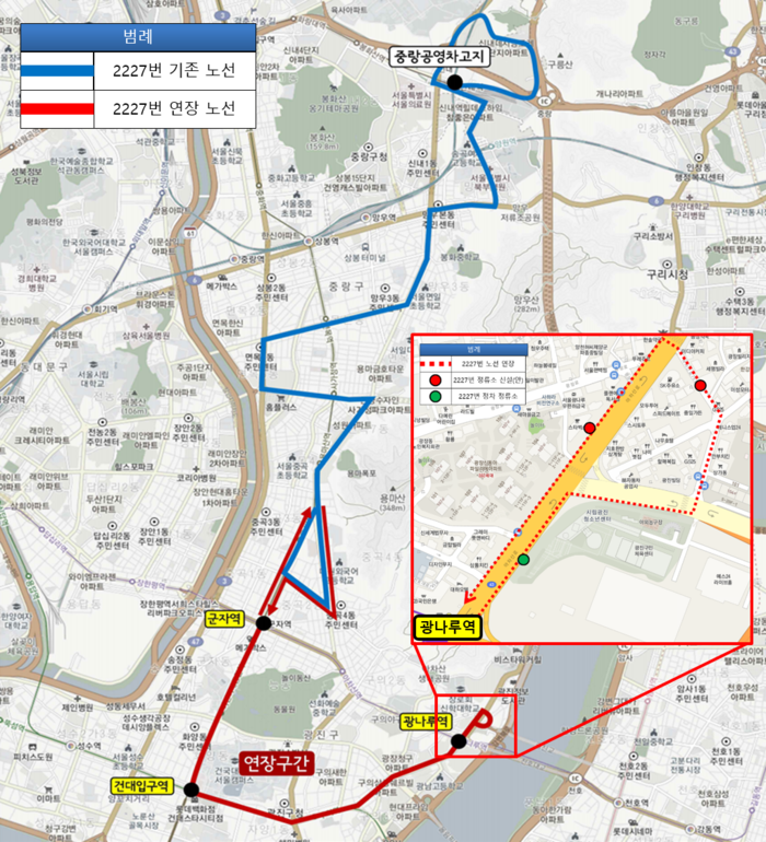 이에 따라 2227번 기존 노선에서 ‘용마사거리~군자역~어린이대공원역~건대입구역~구의역~광나루역’이 추가되며, 운행은 오는 27일부터 시작될 예정이다.