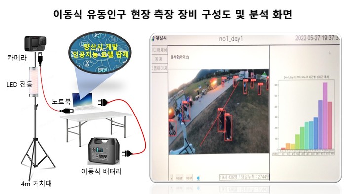 “이동식 유동인구 현장 측정 장비”는 누구나 활용할 수 있는 OpenSource 인공지능 프로그램과 시중에서 쉽게 구입할 수 있는 장비를 조합하여 ‘전국 최초로 개발’되어, 행사장 어느 곳이든 자유롭게 설치 운용할 수 있고, 축제지역 인근 방범용 CCTV 저장된 영상 분석도 가능하도록 개발됐다.