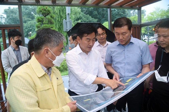 김동근 경기 의정부시장은 13일 의정부서초등학교, 다온중학교까지의 통학로가 불편하고 위험하다는 시민 제보로 가능동 브라운스톤흥선, 의정부더샵파크에비뉴 아파트에 거주하는 학생들의 통학로 현장을 점검했다. 사진은 김동근 시장(왼쪽 두 번째)이 통학로를 살피고 있는 모습. (사진제공=의정부시청)