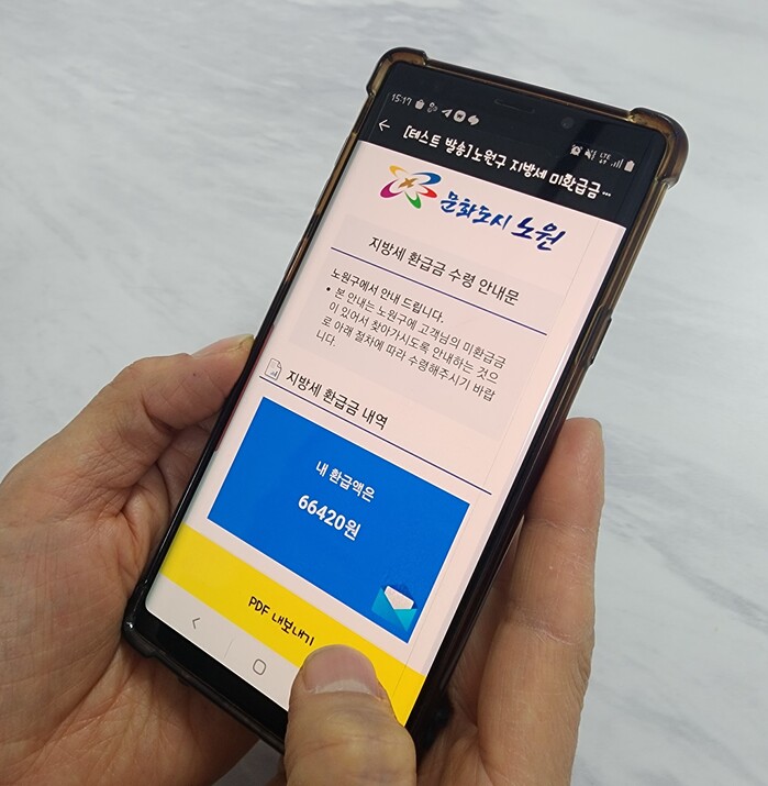 카카오 알림톡 환급 안내 서비스는 납세자에게 개인정보를 암호화해 지방세 환급안내문을 발송하면, 납세자는 본인 인증을 통해 안내문을 열람하고 서울시 ETAX(즉시 입금) 또는 ‘노원구 지방세 환급’ 카카오 채널을 활용해 환급 신청을 할 수 있도록 했다.