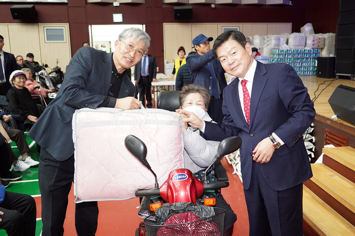 | ▲ 장애인재활증진대회에 참여한 이필형 동대문구청장(사진 오른쪽)이 행운권에 당첨된 주민에게 경품을 전달하고 있다. (사진=동대문구청 제공) |