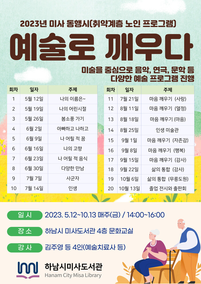 미사도서관은 12일부터 오는 10월13일까지 매주 금요일 오후 2~4시에 수업(20회차 프로그램)을 진행하며, 치매안심센터는 20회차 프로그램을 11일부터 10월12일까지 매주 목요일 오전 10시~낮 12시에 수업(20회차 프로그램)을 진행한다.