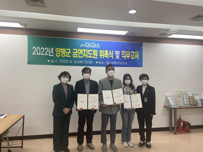 경기 양평군 보건소는 지난 12일 금연지도원 3명을 추가로 위촉하고 직무교육을 실시했다. 위촉된 금연지도원은 금연구역 시설 기준 이행 상태 점검 등 업무를 수행하게 된다. 사진은 이날 위촉식에서 신규 금연지도원과 관계자들이 기념촬영을 하는 모습. (사진제공=양평군청)
