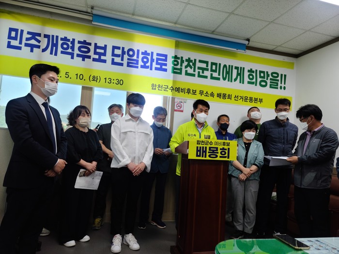 배몽희 예비후보는 "6.1지방선거가 이제 20여일 앞으로 다가왔다"라며 "전직 두 군수의 사법심판에 대해 국민의힘은 사과 한마디 없이 1개월에 가까운 시간을 공천경쟁에 붙잡아두고, 후보의 자질과 도덕성 논란 속에 공천자를 확정하는 등 정치의 변화를 바라는 합천군민의 요구에 찬물을 끼얹기도 했을 뿐 아니라 작대기만 꽂아도 당선이라는 오만함으로 합천군민의 정서를 다시한 번 왜곡하고 있기에, 이에 맞서 합천군민의 명예와 자존감을 회복하고 합천군민에게 새로운 희망을 안기기 위한 민주 개혁 후보 단일화를 추진하고자 한다."고 목소리를 높였다.