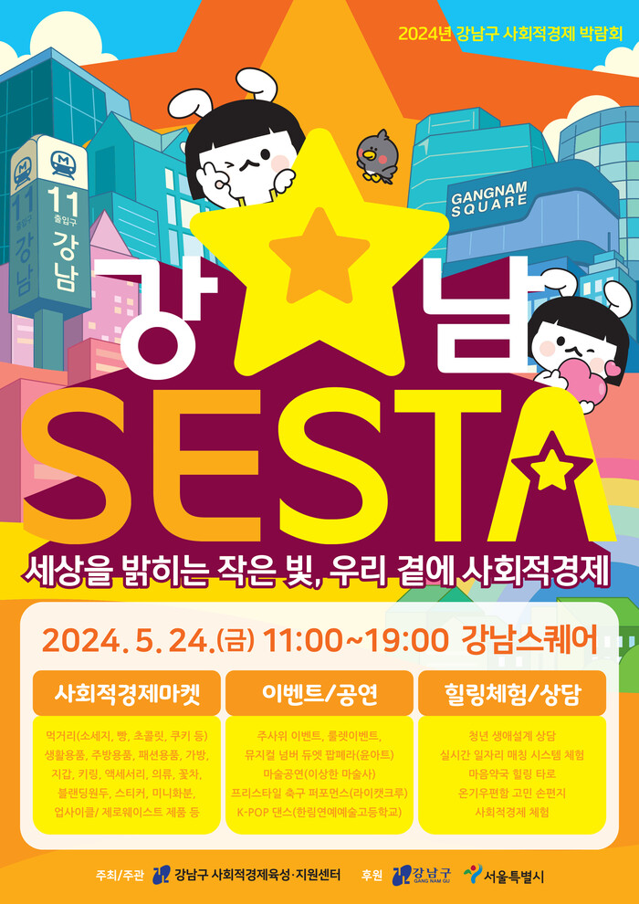 [시민일보 = 이대우 기자] 강남구(구청장 조성명)가 오는 24일 오전 11시~오후 7시 강남스퀘어(강남역 11번 출구 앞)에서 ‘2024 강남구 사회적경제 박람회’를 개최한다.