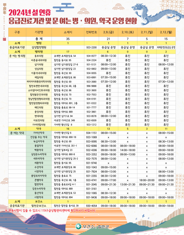 응급진료기관 및 문 여는 병의원‧약국 명단은 군청 및 합천군보건소 홈페이지를 통해 확인할 수 있다. 또한 관내 의료기관, 약국, 읍.면사무소 등 129개소 출입문에 안내문을 미리 부착해 안내하고 있다.