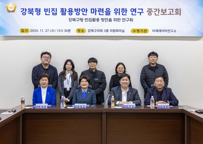 [시민일보 = 문민호 기자] 서울 강북구의회 의원연구단체 ‘강북형 빈집 활용 방안을 위한 연구회’는 최근 의회 3층 의원회의실에서 중간보고회를 개최했다.