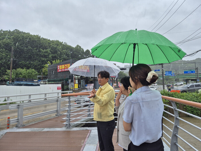 [용인=오왕석 기자] 용인특례시의회 이교우 의원(신봉동,동천동,성복동/더불어민주당)은 7월 17일 호우경보가 발효된 가운데 지난 2022년 여름 집중호우로 범람 피해가 발생한 수지구 고기교 일대를 찾아 여름철 재해 대비 현장 점검을 실시하고, 관련 부서에 철저한 대비와 주민 피해 방지를 당부했다.